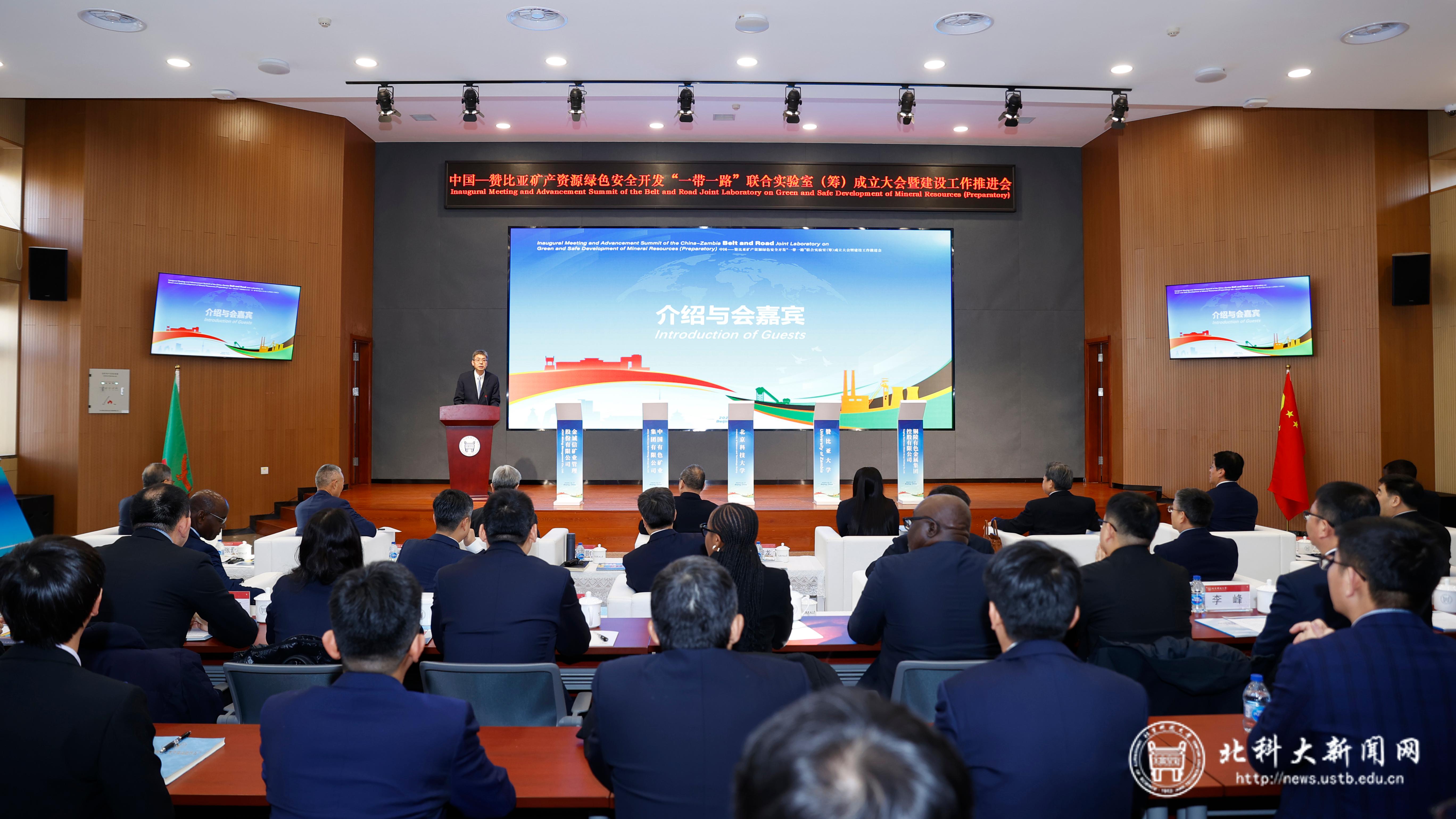 12月17日,中国—赞比亚“一带一路”联合实验室国家级科技创新平台建设工作推进会在学校举行。该实验室聚焦绿色矿产领域,是中赞两国首个“一带一路”联合实验室。中赞两国政府、高校、科研机构及中外合作建设单位代表齐聚一堂,共襄盛举。赞比亚驻华大使馆大使代表娜玛卡朵,赞比亚大学校长蒙迪亚·穆亚,国家矿山安全监察局党组成员、副局长裴文田,中国有色矿业集团有限公司总经理张晋军,中国有色矿业集团有限公司副总经理范巍,铜陵有色金属集团股份有限公司党委书记、总经理文燕,金诚信矿业管理股份有限公司董事长王青海;学校党委书记武贵龙,校长杨仁树,中国工程院院士吴爱祥,副校长张卫冬以及党委常委、宣传部部长尹兆华出席会议。会议由学校副校长焦树强主持。