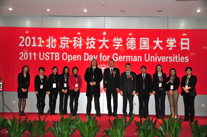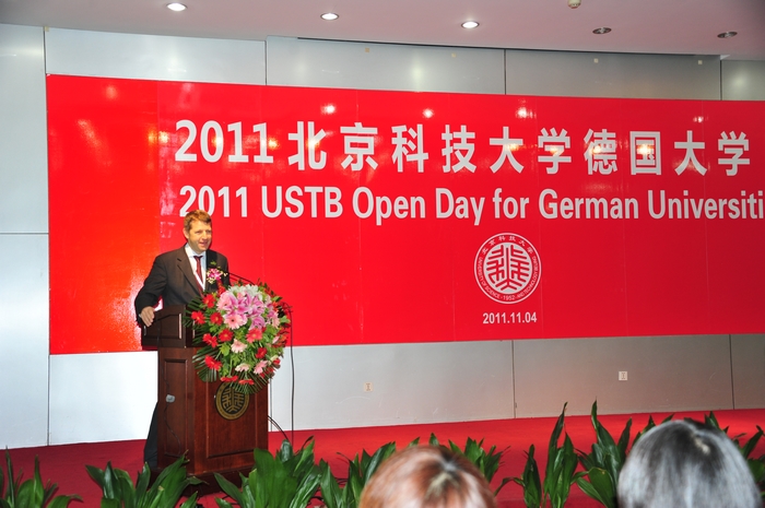 2011 年11月4日上午,2011北京科技大学德国大学日在会议中心逸夫报告馆隆重举行。我校张跃副校长、德国大使馆文化参赞Hardy Boeckle、德意志学术交流中心北京办事处Stefan Hase-Bergen主任以及来自德国使馆、德意志学术交流中心北京办事处和德国多所精英大学的驻华代表参加了本次德国大学日的开幕式,国际处王戈处长主持了开幕式。