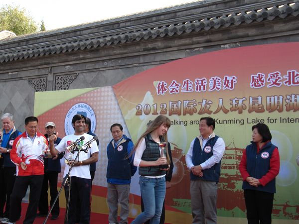10 月27日,“2012国际友人环昆明湖长走”活动在颐和园举办,800多名国际友人绕着昆明湖畔行走8公里。国际处李端老师、雷大伟老师带领40名留学生参加了此次活动。
