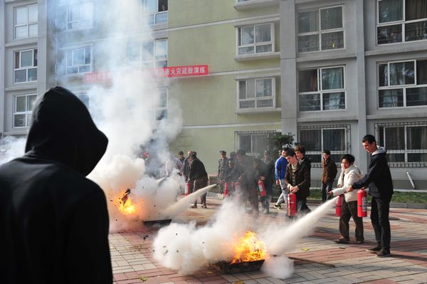 上午 9:30 ,随着白色的烟雾升起,留学生公寓火灾疏散演练正式开始,现场总指挥发出警报命令。接到疏散命令后,指挥人员打开消防通道和所有安全出口,切断电梯电源,各楼层的人员迅速开始撤离。每楼层的指挥人员在各楼层疏散位置协助大家疏散,所有人员按照逃生要求迅速逃离火场,集结到安全地带,十分钟内全部撒离完毕。疏散演练之后,保卫处工作人员向留学生详细讲解并示范了常用灭火器的使用方法。留学生同学积极动手操作,现场掌握灭火器的使用方法和相关消防知识。随后国际处副处长赵立英对此次火灾疏散演练进行了简短点评,她指出此次疏散演练在保卫保密处的积极指导下,留学生同学积极参与,增强了大家在火灾发生时的逃生能力,取得了预期效果。