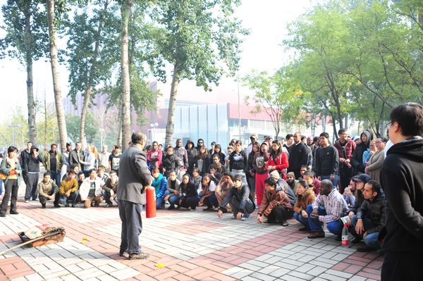 10 月 27 日上午,为了增强留学生发生火灾时的逃生能力,掌握有关消防器材的使用方法,留学生公寓举行了火灾应急疏散及消防教育演习。保卫保密处和国际合作交流处负责人共同担任现场指挥,保卫保密处工作人员、国际处留学生管理干部、公寓全体工作人员及留学生 200 多人参加了演习。